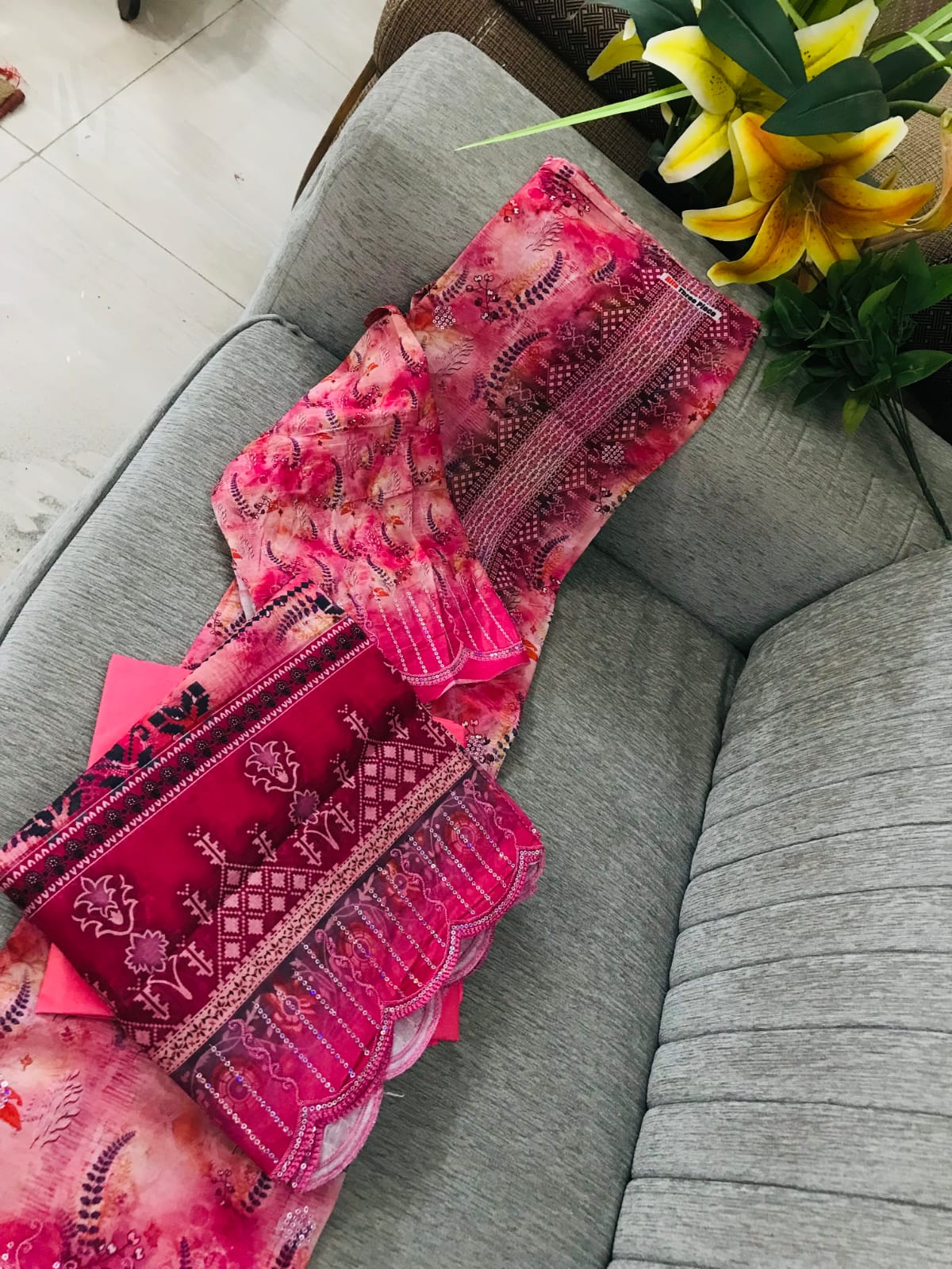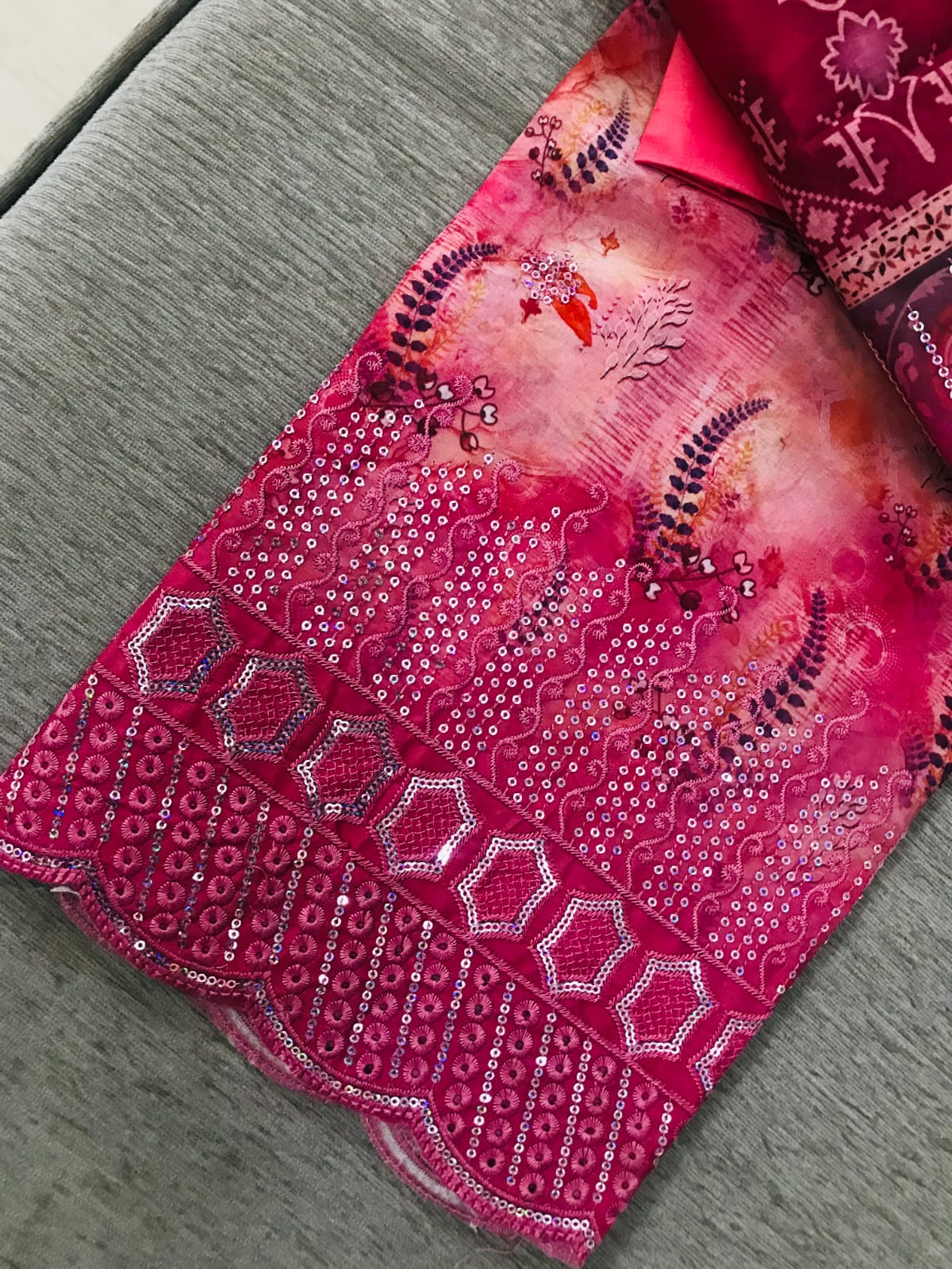 - Kameez (Top): The kameez is crafted from high-quality cotton featuring a soft pink and magenta digital floral print. It is beautifully accented with delicate sequin work and intricate embroidery along the neckline and the daman (bottom hem).