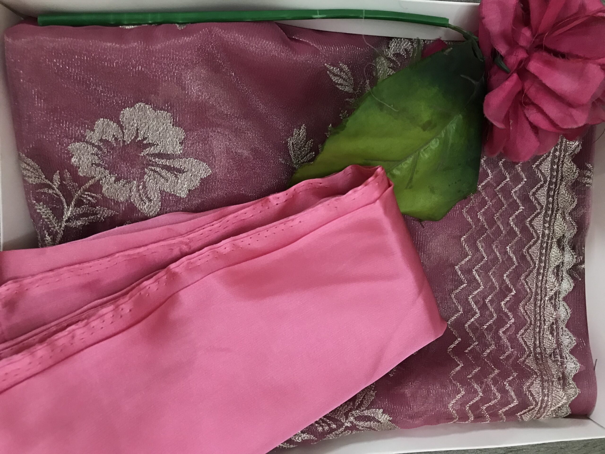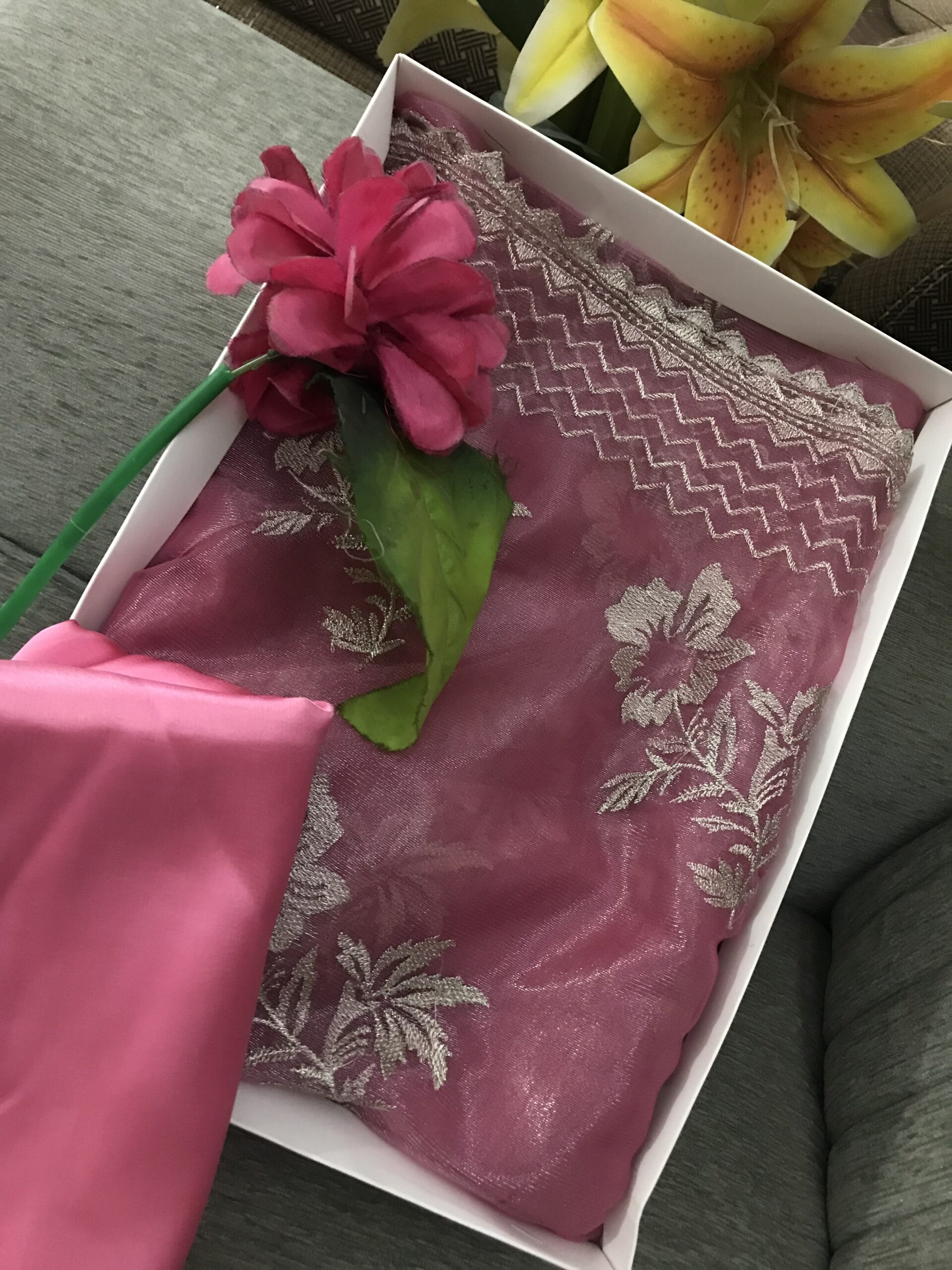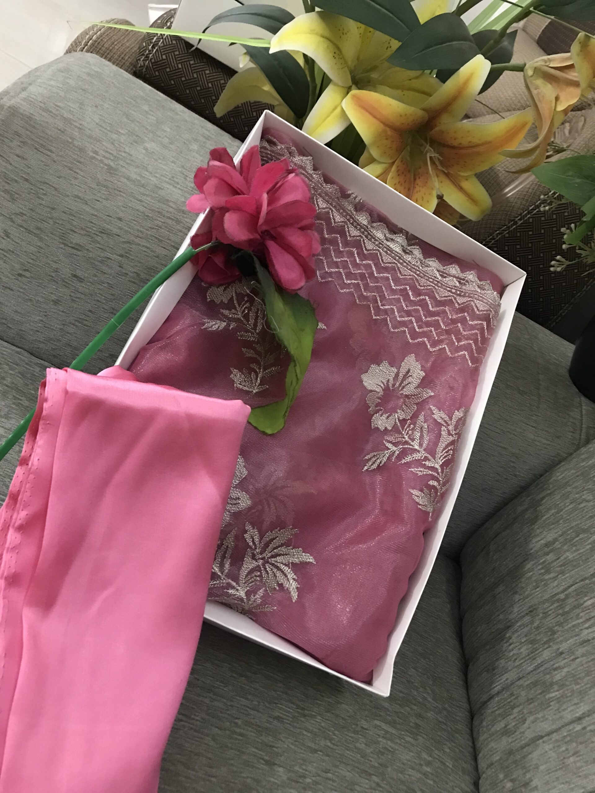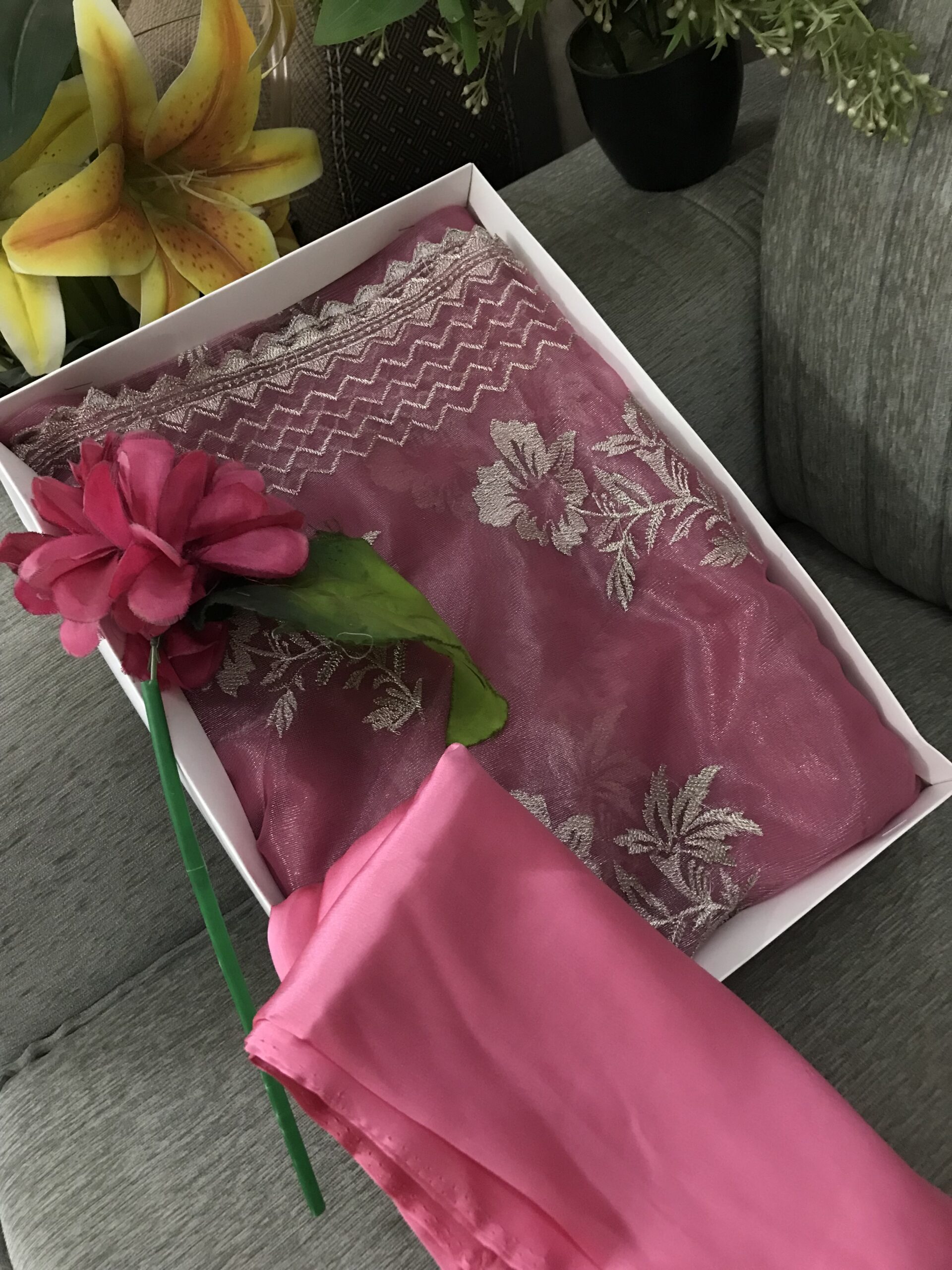 - Blouse Piece: Comes with a matching Satin-finish fabric in a vibrant pink tone, providing a stylish contrast to the sheer organza.