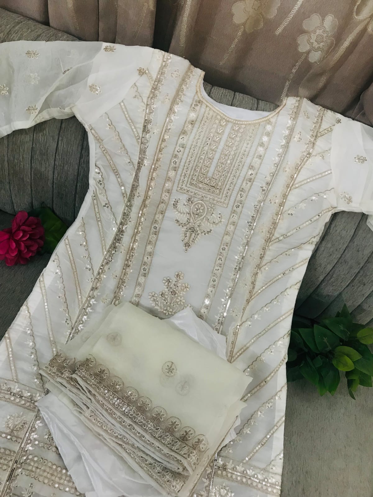 Exquisite Off-White Embroidered Organza 3-Piece Pakistani Suit